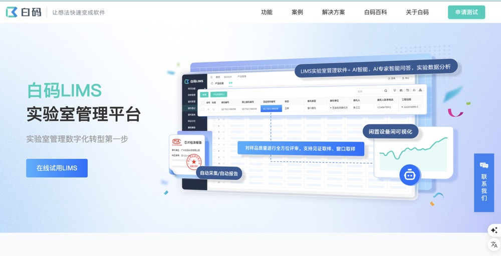 网站简介: 白码LIMS实验室管理平台主要解决实验室数字化与实验室合规性,通过LIMS系统实现设备数据自动采集,快速生成实验报告、原始记录,推动实验室合规性数字化转型,节省超36%以上成本。