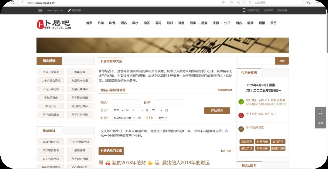 网站简介: 本站是网上算命最准的网站,主要测算项目有生辰八字算命,姓名测试,在线算命,周易算命,在线抽签,姓名算命,起名网免费测名,在线算命,老黄历查询,周易占卜,八字算命婚姻,周公解梦,万年历,周易算卦,手机号码测吉凶,姓名配对,车牌号码吉凶,塔罗牌占卜,2025年生肖运程,宝宝起名打分,起名字大全等内容!