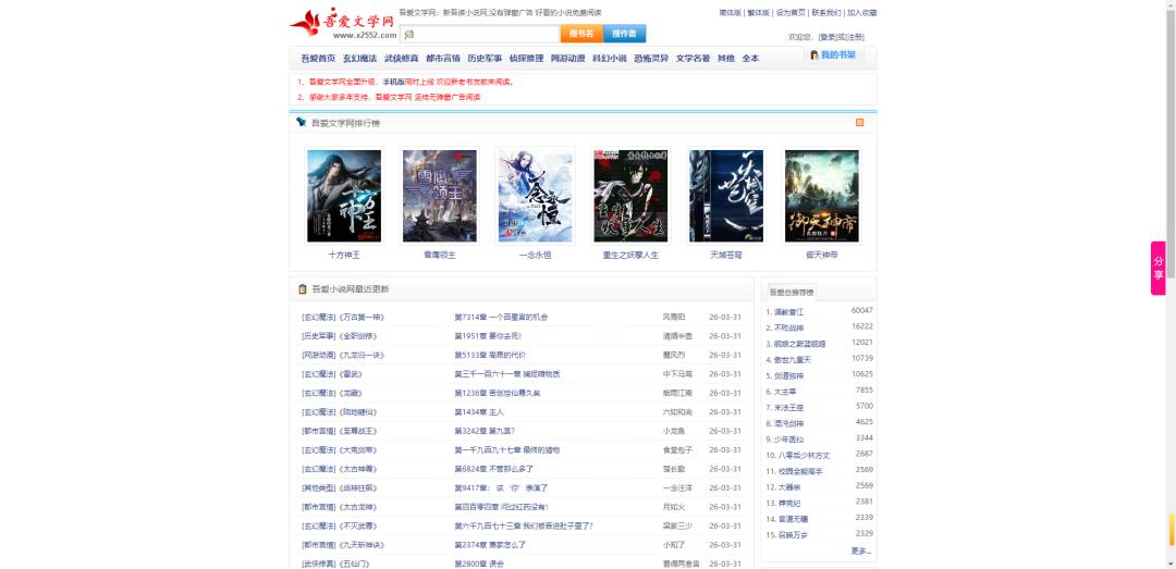 网站简介: 吾爱文学网(x2552.com)是无弹窗小说网站,吾读小说网提供最新,最好看的小说阅读与下载。看好看的小说,就来吾爱文学网。