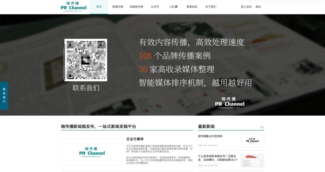 网站简介: 暗传播是一家从事新闻发稿和软文发布推广为主的公司!平台拥有全国10万+媒体资源,专注新闻稿发布,报纸发布,品牌营销推广及软文代写服务。