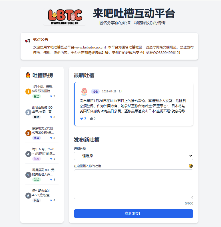 网站简介: 来吧吐槽|不用注册,直接开喷! 每天更新热点、职场、生活、娱乐槽点, 匿名吐槽、即时互动,解压神器, 来把不爽一次性吐干净!