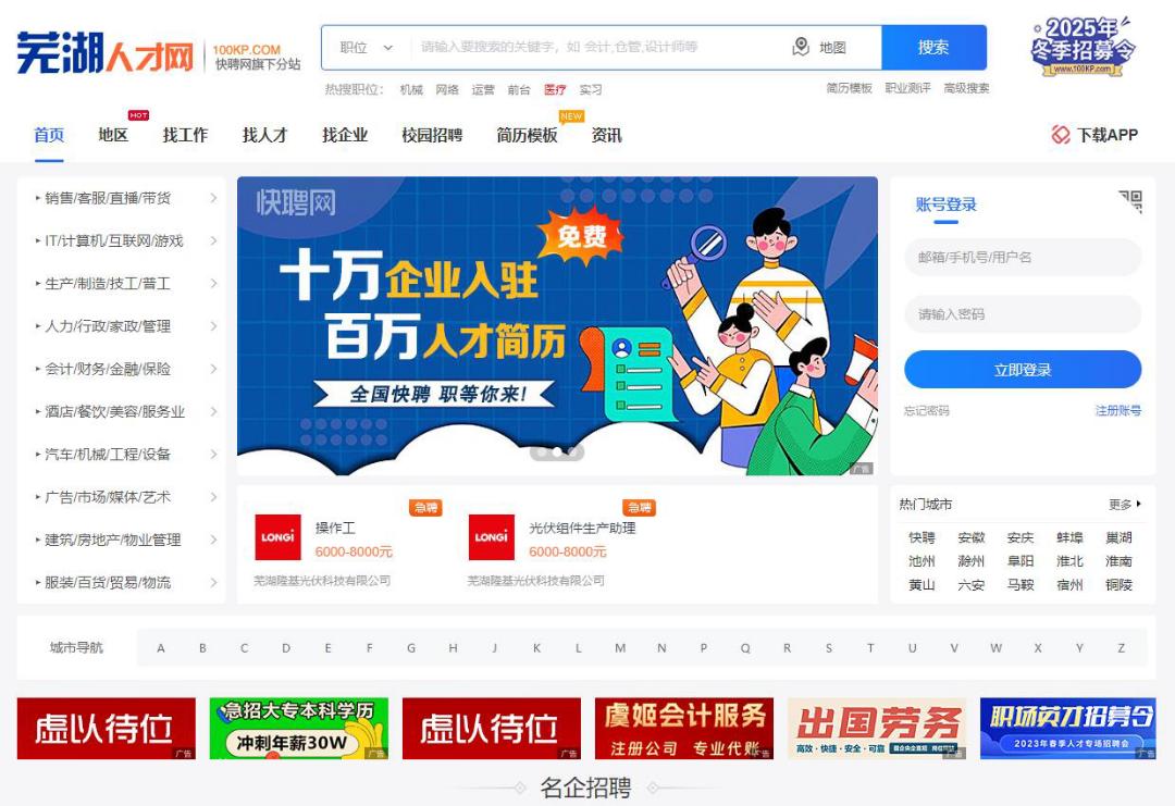 网站简介: 芜湖人才网是专业的人才求职招聘网站,为企业提供最新岗位职位,为大学毕业生求职者提供最新公司招聘信息,,找工作上快聘人才网100kp.com