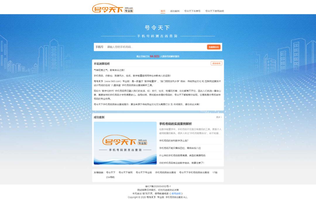 网站简介: 号令天下(www.5i65.com.cn)手机号码测吉凶查询为你提供:免费手机电话号码吉凶查询,通过易经五行结合数字能量八星排盘来进行运势分析,测号码吉凶就用号令天下手机号码测吉凶查询,超准!