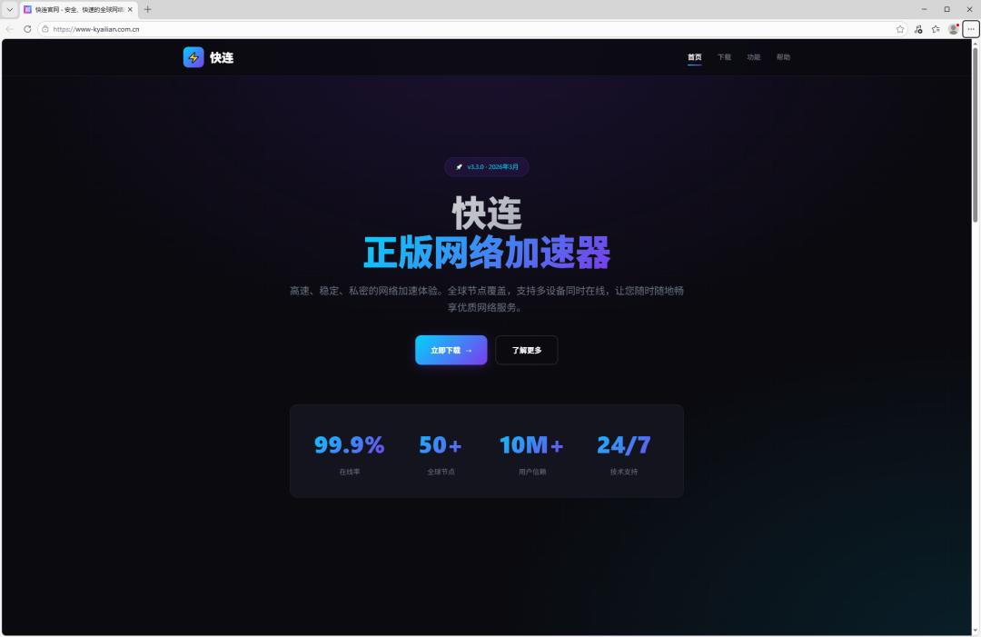 网站简介: 快连提供 Windows、macOS、iOS、Android 多平台客户端下载,支持全球网络加速、跨境办公、流媒体访问与日常隐私保护。页面包含产品功能、节点覆盖、套餐价格、下载安装入口与常见问题。