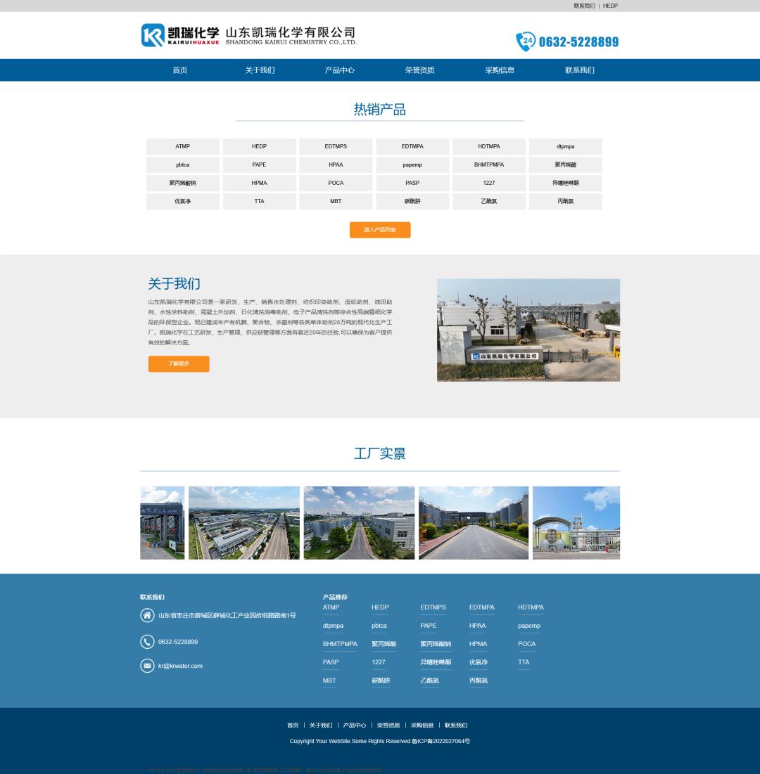 网站简介: 山东凯瑞化学有限公司位于山东枣庄市薛城化工产业园,占地约100亩。于2015年成立,注册资本1.28亿元。是一家集研发、生产、销售 水质稳定剂、 纺织印染助剂、 造纸助剂、 油田助剂、 水性涂料助剂、 混凝土外加剂、 日化清洗消毒助剂、 电子产品清洗剂等综合性高端精细化学品的环保型企业。