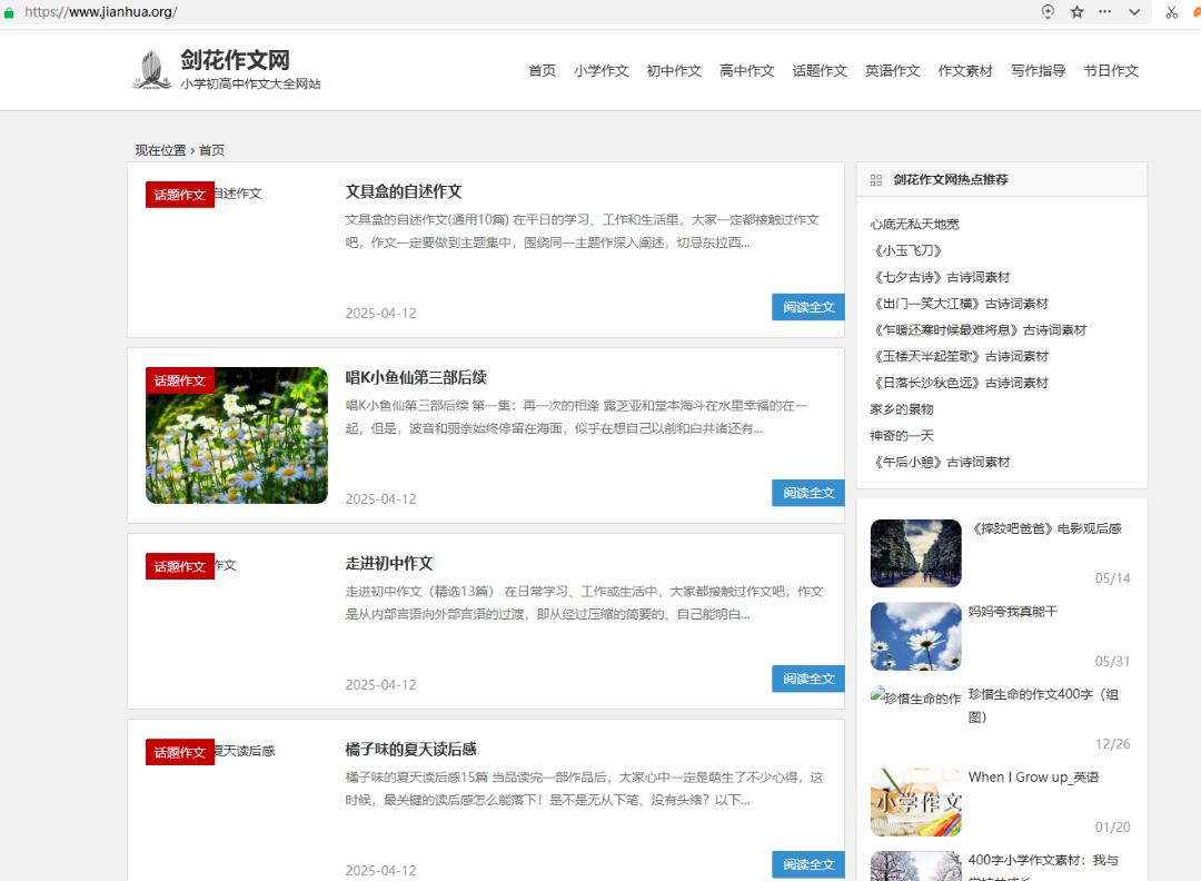 网站简介: 剑花作文网,初中作文,高中作文,小学作文,作文大全网站,英语作文,中招满分作文,高考满分作文,小升初作文素材免费下载,作文写作技巧指导,让初高中小学作文写作更简单化.