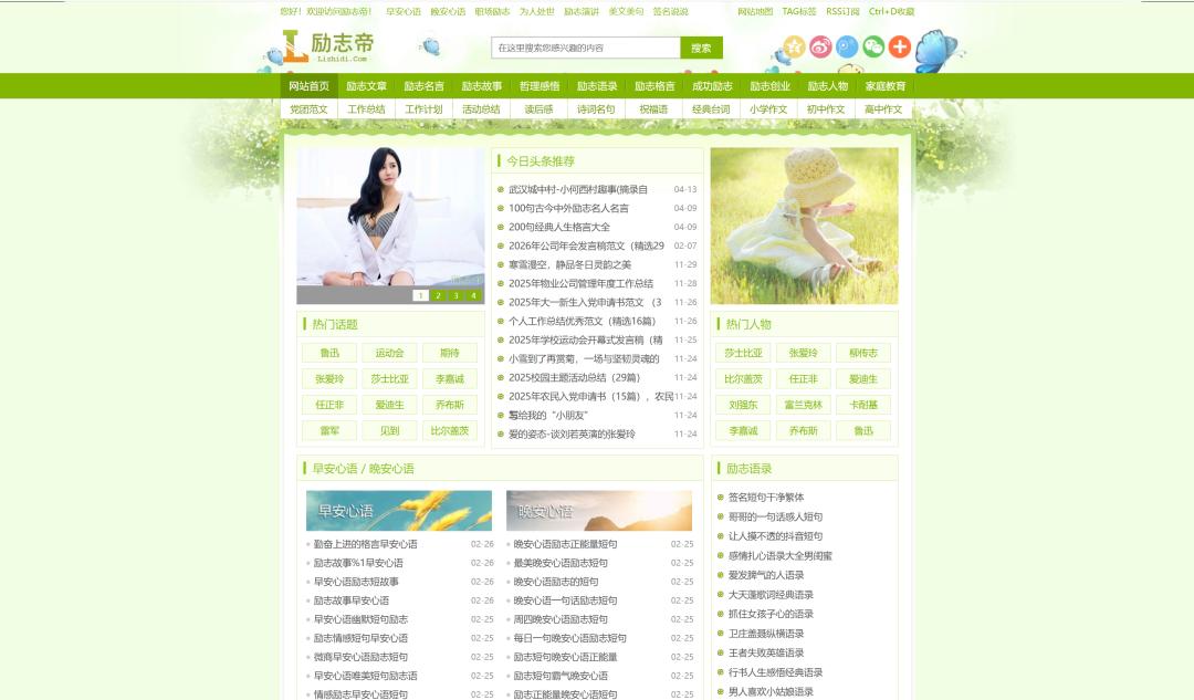 网站简介: 励志帝汇集各种正能量的名人名言,励志故事,励志人物,人生哲理,成功励志,励志创业,励志语录经典短句等励志文摘在线阅读,我们积极做一个正能量的励志网站