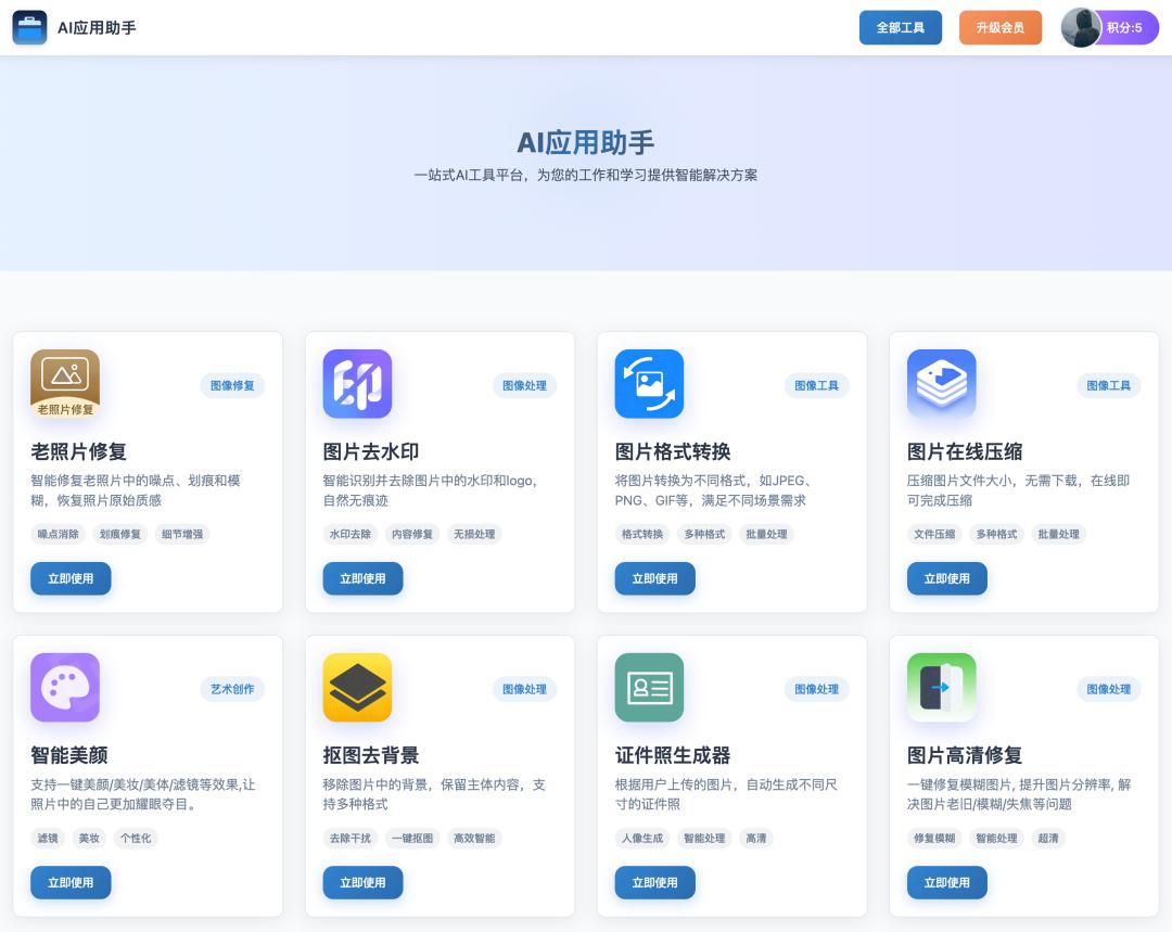 网站简介: 专业的AI工具平台,提供图像处理、文字生成、数据分析、编程协作等多领域智能工具。涵盖老照片修复、图片格式转换、在线压缩、AI写作、代码生成等实用功能。免费在线使用,提升工作效率。