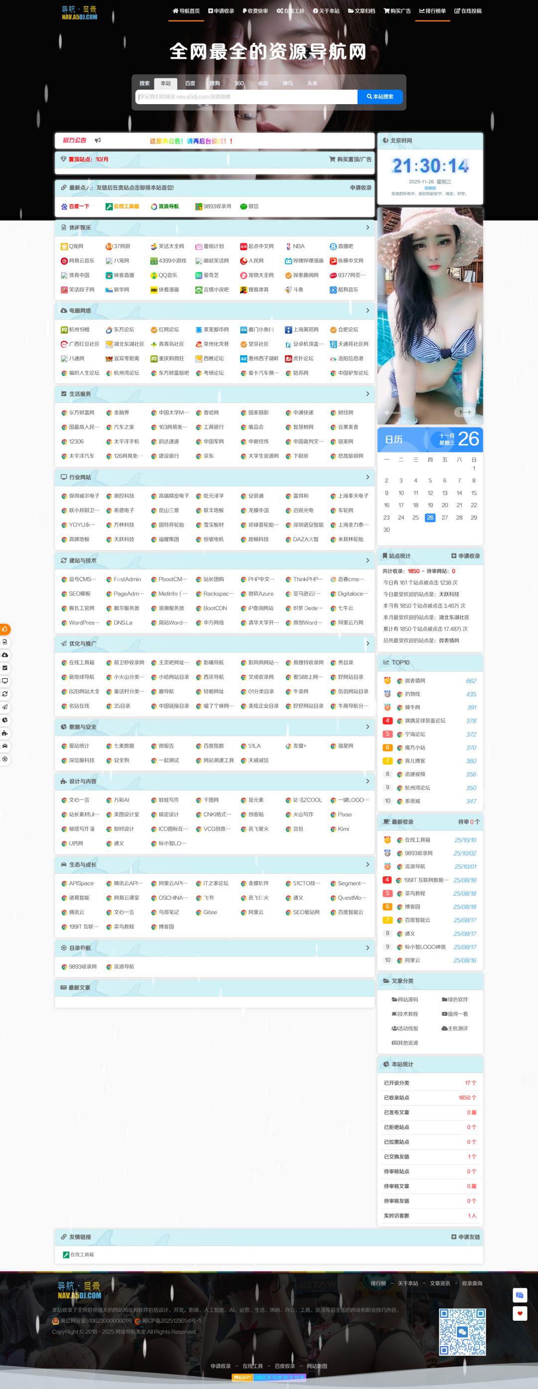 网站简介: 网址导航大全(nav.a5dj.com),生活常用网站大全,支持自定义编辑收藏个人常用网址。另外还收集设计师、网络运营、站长工具、专业技术、资源网站等各行各业优秀网站,欢迎您来体验。