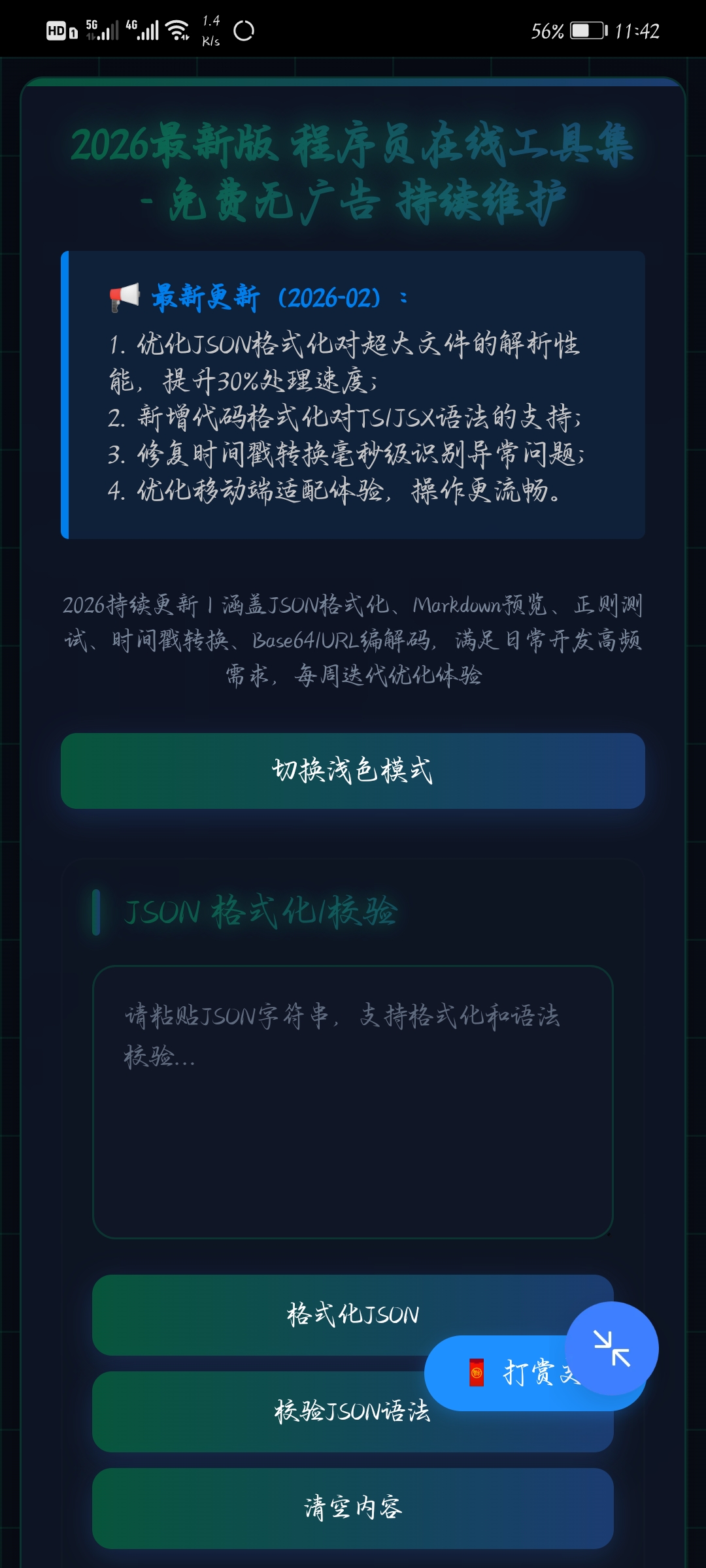 网站简介: 2026持续更新 | 涵盖JSON格式化、Markdown预览、正则测试、时间戳转换、Base64/URL编解码,满足日常开发高频需求,每周迭代优化体验