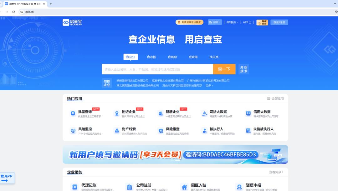 网站简介: 启查宝是专业的企业信息查询平台,覆盖全国超4.2亿家企业;提供实时企业工商注册、法定代表人、股权结构、司法风险、经营异常、知识产权、招投标、资质证书等全维度信息。支持批量查询、深度穿透、智能关联、风险排查、司法大数据分析,是银行、律所、投资机构及中小企业主开展信用尽调与商业决策的可信数据源。